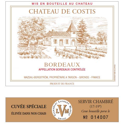Château de Costis has an extraordinary deep, shiny, red color. The aroma is powerful with a lot of frutiness. The taste is soft with a very good amount of tannin for a Bordeaux wine. It is a very well balanced wine.