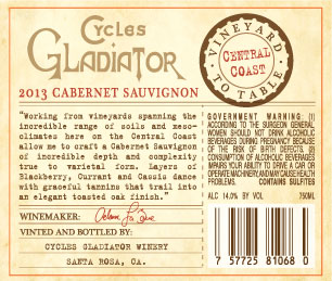 The Central Coast of California is home to a number of grape growing regions that are exceptional for producing world-class Cabernet Sauvignon wines. From the Santa Ynez Valley to the south to the Livermore Valley in the north, there are several appellations that yield wines that are unique and terroir-driven. I have the opportunity to cull the finest grapes from a handful of these to put together a wine that encompasses the best characteristics that each area has to offer. The 2014 Cycles- Gladiator Cabernet Sauvignon is a blend of wines made from three vine- yards. One is located on the east side of Paso Robles and offers bright red fruits to the blend. Another comes from the Indian Valley of southern Monterey County and provides the structure. The final Cab component, which makes up the majority of the blend, comes from the Collier Canyon Vineyard located on the north hills above the city of Livermore on south facing slopes. This is where the flavors come from. I have also added a little Merlot from Paso Robles to tie all of the disparate flavors together.Grapes were harvested over a one and a half month period starting in mid-September. The lots were all fermented separately and blended at about the 6 month point. About 30% saw a mix of new French and American wood. The wine was finally finished up in September of 2015 and bottled during the third week of October. I’m pumped at the results.