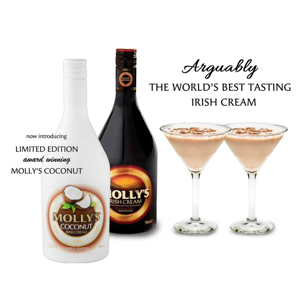 Molly’s Irish Cream Liquor is a premium blend of fresh dairy cream, aged Irish Whiskey, fine Irish Spirits, and natural chocolate flavours. Molly’s uses the freshest possible, highest quality Irish cream which is sourced locally from grass fed cows- in fact, it is so fresh that it typically takes only 48 hours from cow to bottle. With a long history in cream liquor blending and using state of the art technology, Molly’s is arguably the world’s best tasting Irish Cream Liqueur. Today, Molly’s is enjoyed in over 40 countries worldwide, spread across six continents.